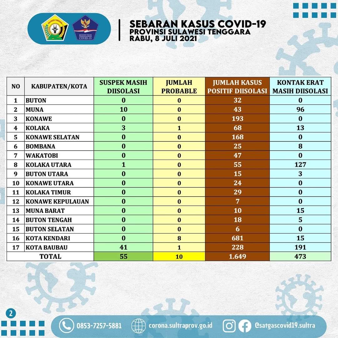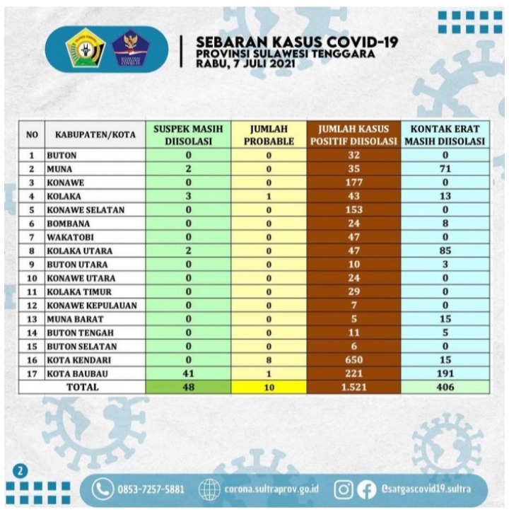 BUTON TENGAH SULTRA DEMO. CO.- Baru baru ini, tim gugus tugas penanganan covid-19 (Satgas covid) provinsi Sulawesi Tenggara (Sultra) merilis data sebaran covid-19 yang ada di 17 Kabupaten/kota.