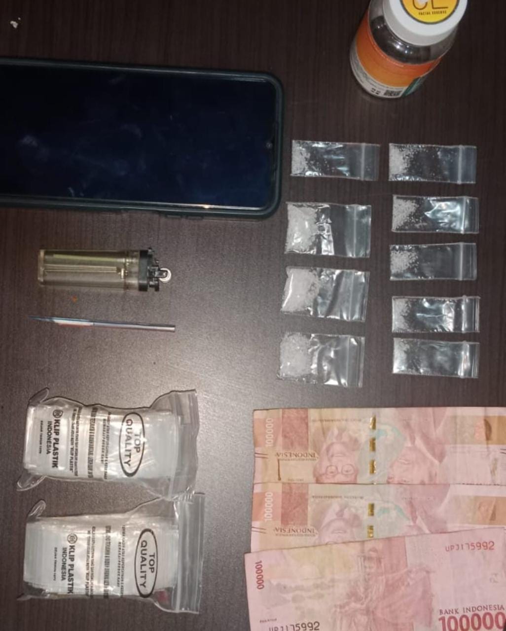 Dari hasil pengeledahan itu, anggota menemukan Barang Bukti (BB) Narkotika sebanyak 9 (sembilan) sachet plastik bening berisikan Narkotika jenis Shabu dengan berat netto 4,45 gram, serta BB Non Narkotika seperti 1 (satu) botol kaca, 2 (dua) pack sachet kosong, 1 (satu) buah sendok terbuat dari pipet runcing, 1 (satu) buah korek gas, 1 (satu) hp merk vivo dan 3 (tiga) lembar uang pecahan seratus ribu rupiah