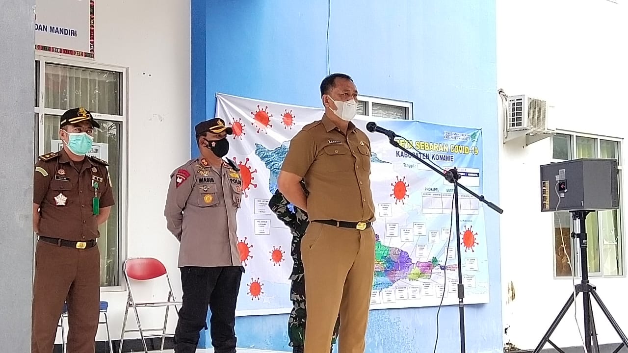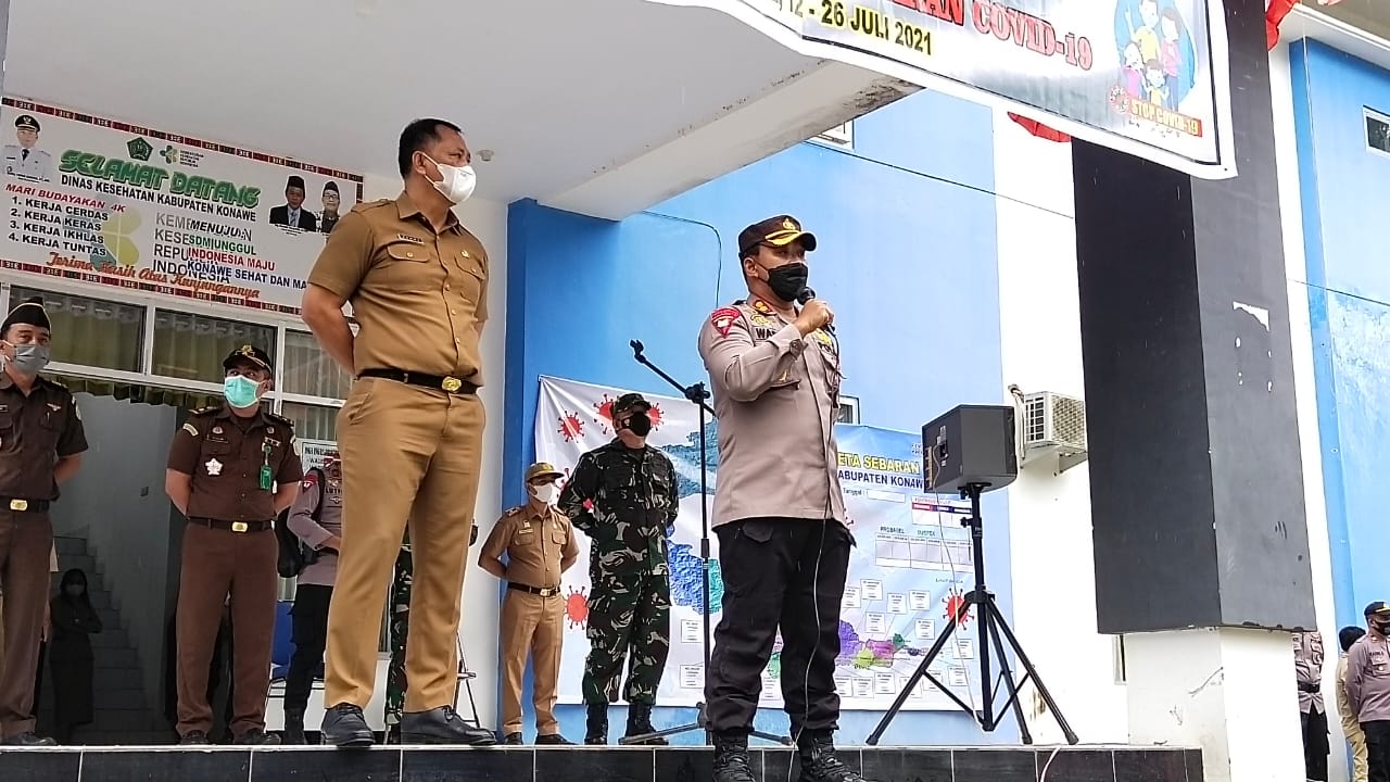 Apel dipimpin langsung Sekretaris Daerah (Sekda) Konawe, Ferdinan Sapan. Turut hadir Kapolres Konawe, AKBP Wasis Santoso, SIK, kepala OPD, camat dan regu petugas PPKM dari berbagai instansi, yakni TNI, Polri, Dishub, Dinkes, serta Pol PP.