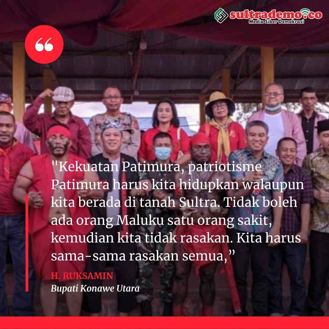 “Kekuatan Patimura, patriotisme Patimura harus kita hidupkan walaupun kita berada di tanah Sultra. Tidak boleh ada orang Maluku satu orang sakit, kemudian kita tidak rasakan. Kita harus sama-sama rasakan semua,”tegas Ruksamin dengan nada semangat sembari mengepalkan tangannya sebagai wujud persatuan dan kesatuan.