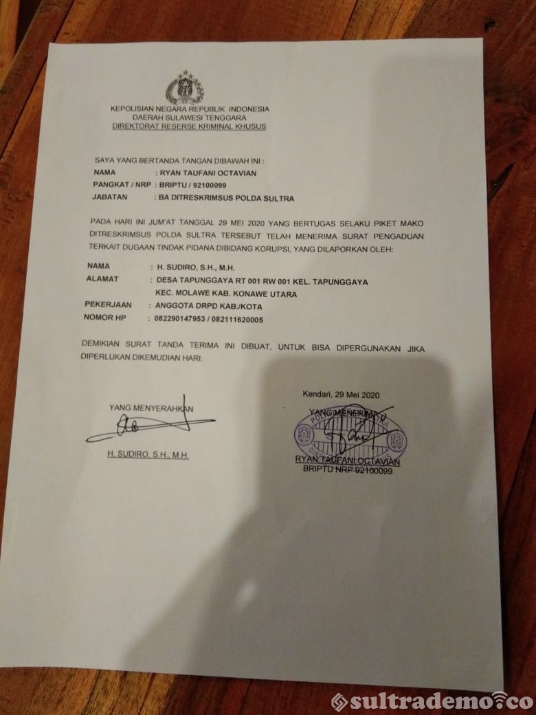 Kendari, Sultrademo.co – Ketua Dewan Pimpinan Daerah (DPD) Partai Nasdem Kabupaten Konawe Utara (Konut), Sudiro melaporkan dugaan tindak pidana korupsi Bupati Konut, H. Ruksamin ke Direktorat Reserese Kriminal Khusus (Ditreskrimsus) Kepolisian daerah (Polda) Sualwesi Tenggara (Sultra).