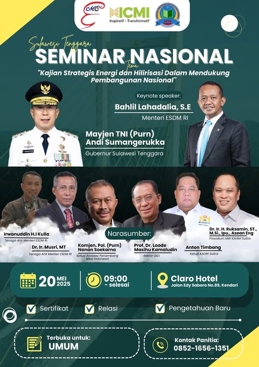 Menteri Energi dan Sumber Daya Mineral (ESDM) RI, Bahlil Lahadalia, S.E., dijadwalkan hadir sebagai keynote speaker. Seminar ini juga akan dihadiri Gubernur Sultra, Mayjen TNI (Purn) Andi Sumangerukka.