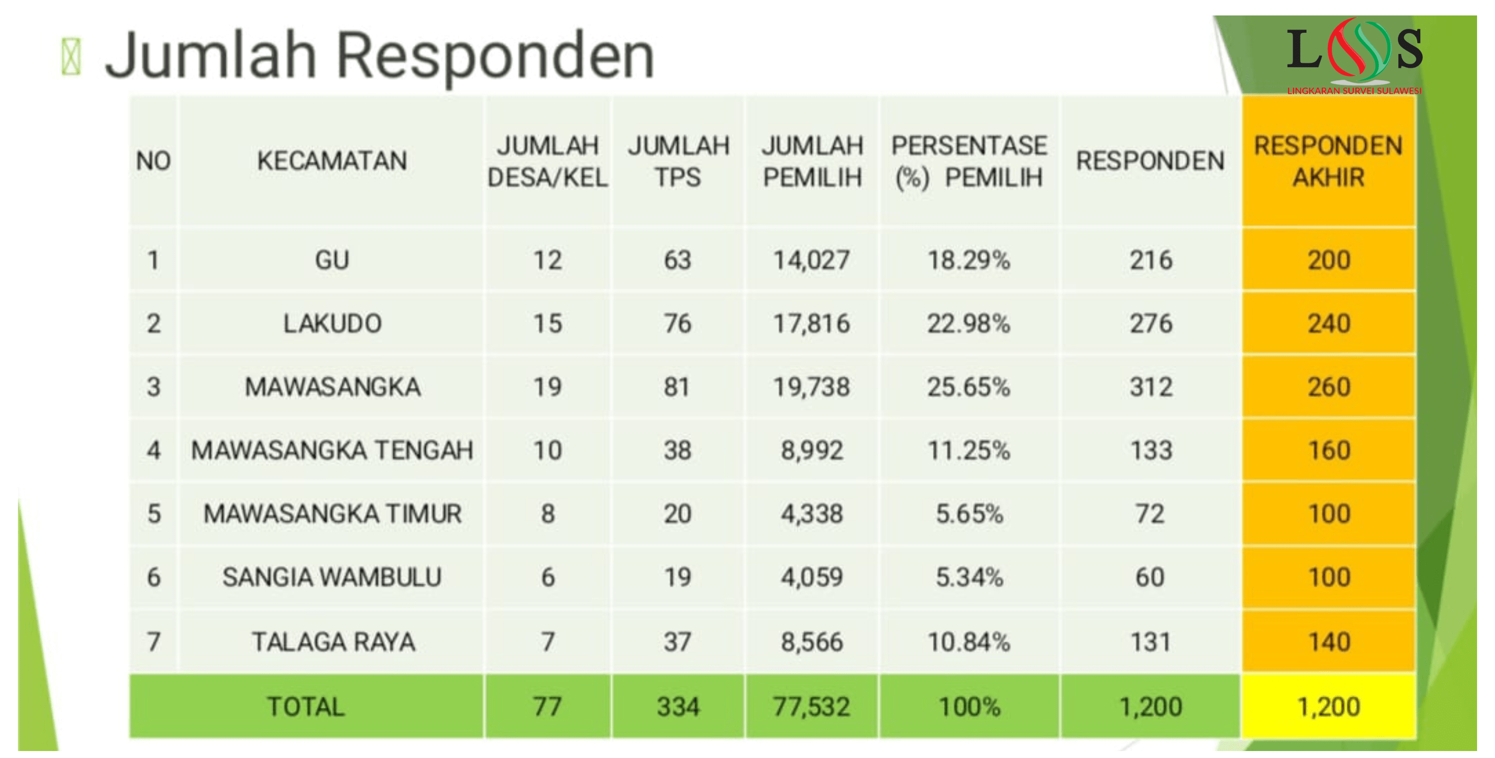 Ia menerangkan pengumpulan data survei tersebut dilakukan pada 9-15 Desember 2023. Dengan menggunakan metode sampling multistagne random sampling. Dan untuk populasi adalah seluruh masyrakat Kabupaten Buton Tengah yang telah menjadi wajib pilih sebanyak 1200 responden berasal dari 77 Desa/Kelurahan dan 7 Kecamatan.