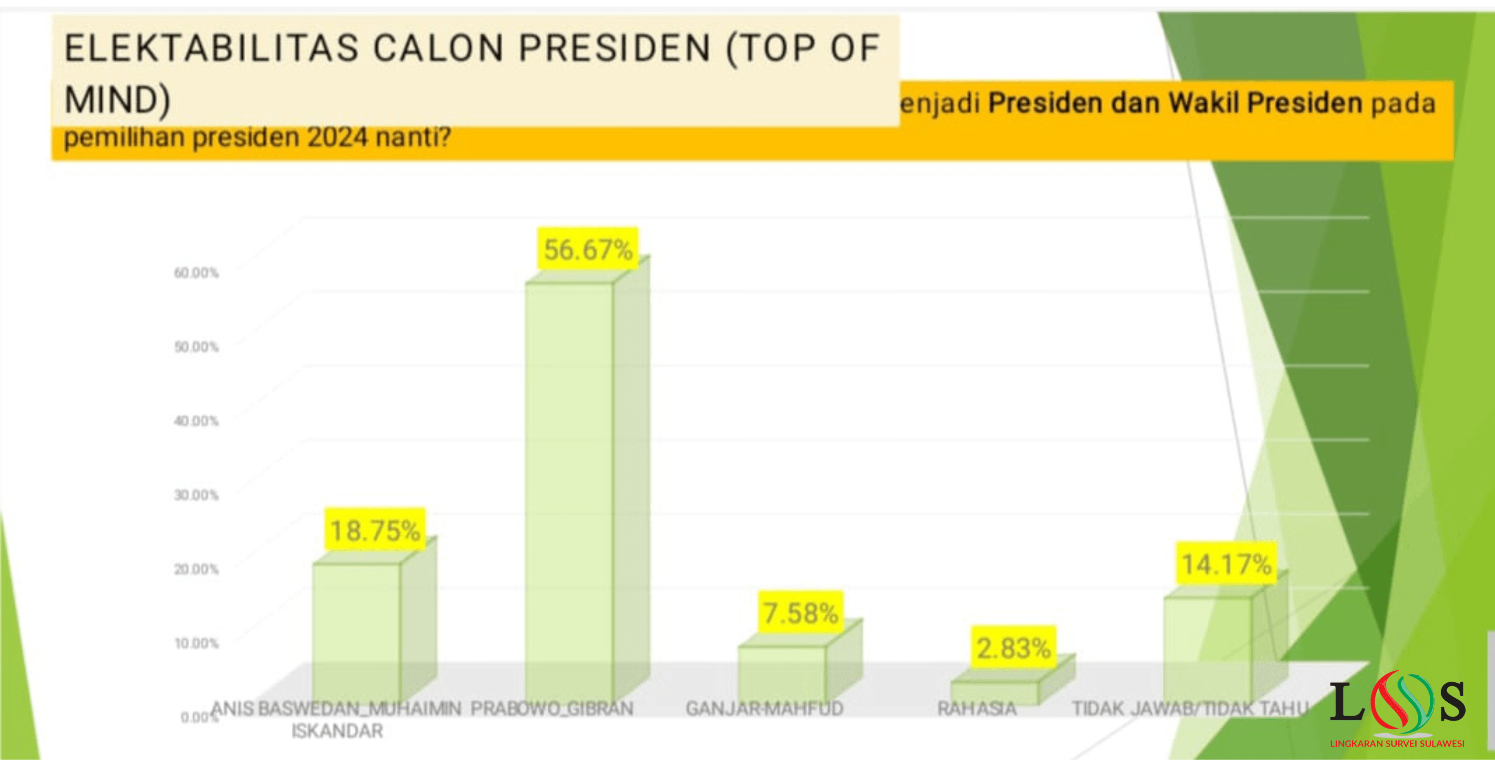 “Hasilnya pasangan Prabowo-Gibran 56,67%, Anies-Muhaimin (AMIN) 18,75% dan Ganjar-Mahfud 7,58%. Adapun yang tidak menjawab 14,17% dan masih rahasia 2,83%,” ujar Direktur Ekseskuti LSS Andi Muhammad Hasgar saat dikonfirmasi, Kamis (4/1/2024).