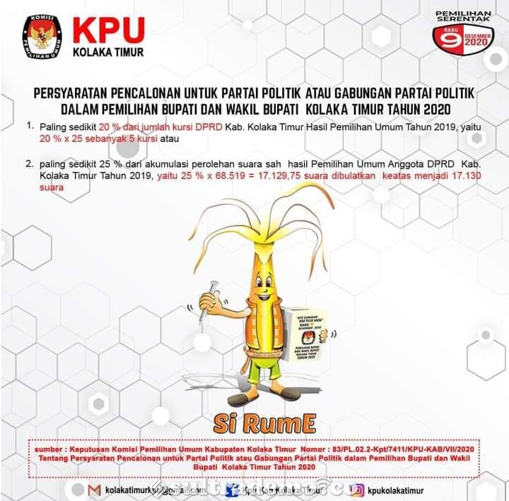 Ketua KPU Kabupaten Kolaka Timur, Suprihaty Prawaty Nengtias SP MP menjelaskan, untuk mengajukan pasangan calon kepala daerah, parpol atau gabungan parpol paling sedikit memiliki 20% kursi dari jumlah kursi DPRD Kabupaten Kolaka Timur hasil pemilihan umum tahun 2019 yaitu 20% × 25 sebanyak 5 kursi.