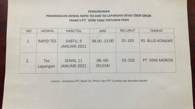 Konawe, sultrademo.co – Pengumunan Pemanggilan Rapid Test dan Tes Lapangan CTKL VDNI Divisi Crew Umum ….