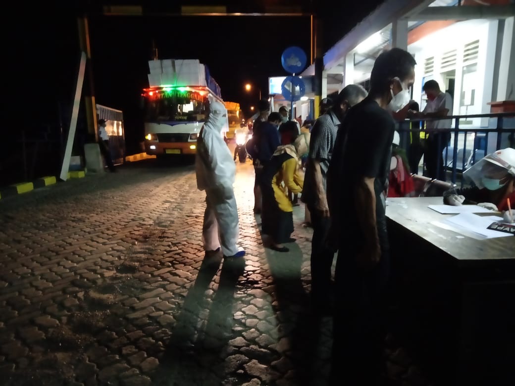 Satgas Covid-19 Kabupaten Kolaka Lakukan Penyemprotan Disinfektan dan Pengecekan Suhu Badan di Pelabuhan Penyeberangan Kolaka-Bajoe