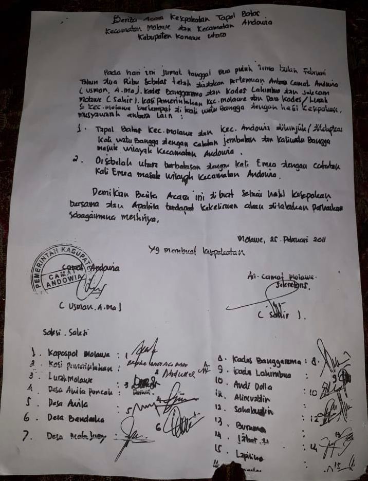 Kesepakatan lama tersebut, diakui keberadaannya pada saat di lakukanya musyawarah di hadapan Kapolres Konut, Camat Andowia serta Camat Molawe pada sabtu tertangal 16 april 2022. Namun saat itu belum bisa suguhkan keberadaannya karna merupakan arsip lama yg harus di cari terlebih dahulu