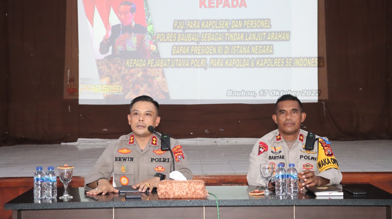 Baubau, Sultrademo.co – Sebagai tindak lanjut pertemuan Presiden Joko Widodo kepada pejabat Polri di Istana Negara beberapa waktu lalu. Kapolres Baubau AKBP, Erwin Pratomo memberikan arahan terhadap PJU, para Kapolsek dan seluruh personel Polresta Baubau di Aula Kemitraan Polresta Baubau, pada Senin (17/10).