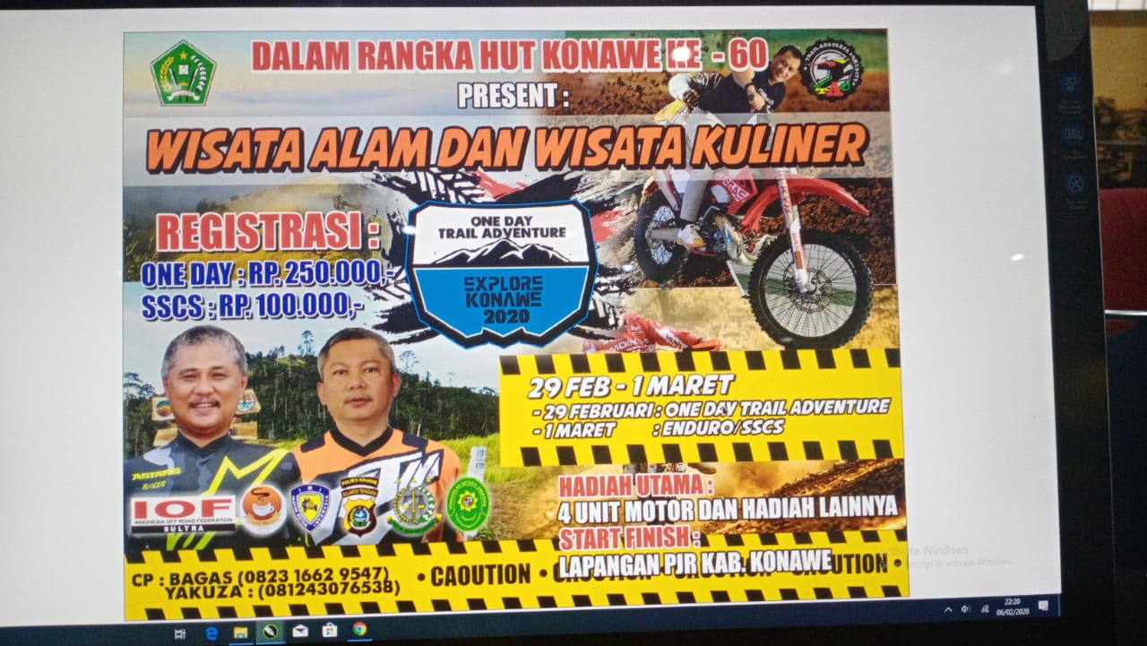 Unaaha, Sultrademo.co – Dihari Ulang Tahun (HUT) Kabupaten Konawe kee-60 tahun 2020 nanti, Pemerintah Daerah (Pemda) Konawe dan Trail Adhyaksa Community (T A C) Konawe akan menggelar event bergengsi One Day Trail Adventure dengan tema Trabas Wisata Konawe Dan Wisata Kuliner .