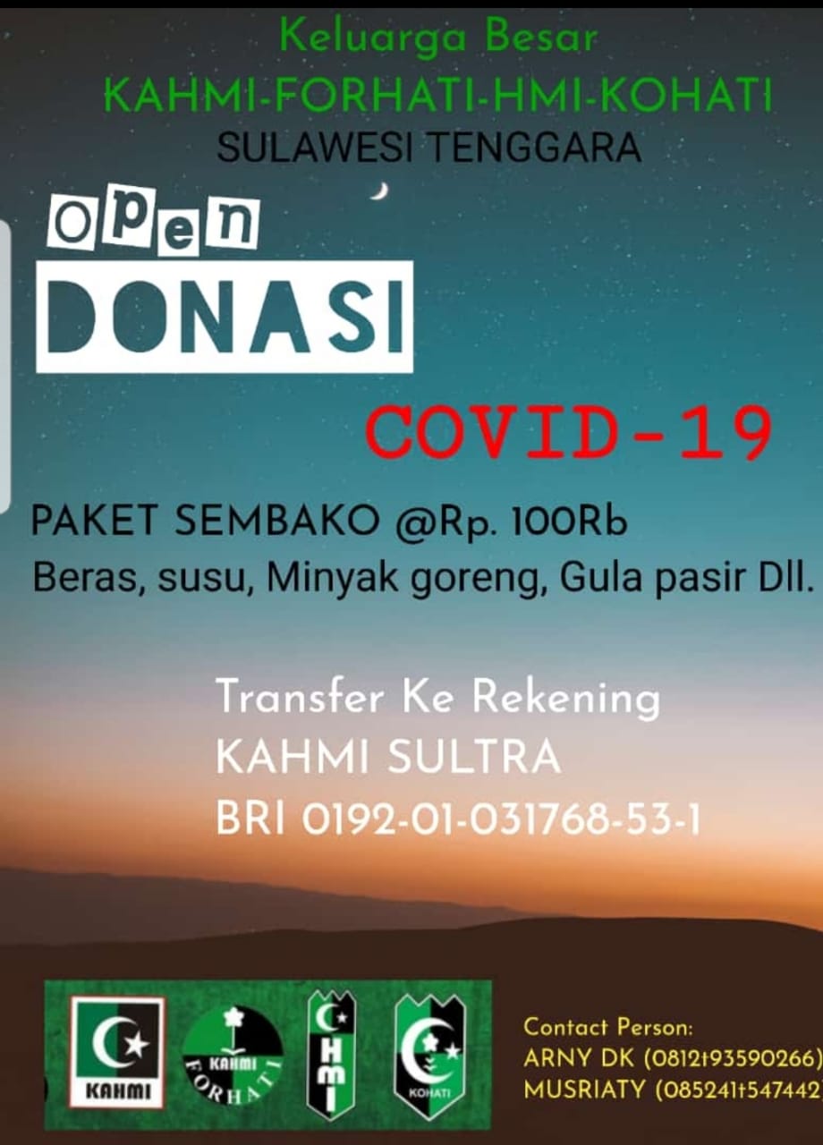 Oleh Karena itu Majelis Wilayah KAHMI dan Forum Alumni HMI-Wati Sulawesi Tenggara (FORHATI Sultra) menginisiasi untuk melakukan penggalangan dana dalam memenuhi kebutuhan pokok masyarakat dan pengadaan Alat Pelindung Diri (APD), yang rencananya akan di distribusikan untuk beberapa fasilitas Kesehatan dan tenaga medis yang menjadi garda terdepan dalam penanganan pasien Covid-19, dan memiliki resiko tinggi dalam penularan Covid-19, olehnya itu MW KAHMI -FORHATI Sultra melakukan hal ini dengan harapan dapat meringankan beban masyarakat untuk memenuhi kebutuhan pangannya sehari2 dan berharap agar rekan rekan tenaga medis mampu melaksanakan tugasnya dengan maksimal dan dengan Fasilitas APD yang memadai dan sesuai standar meskipun donasi ini masih sangat minim namun semangat untuk bersama melawan COVID -19 menjadi tanggungjawab kita bersama.