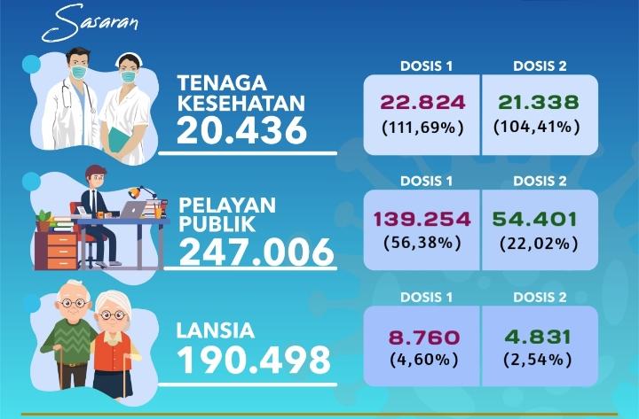 “Vaksinasi bagi petugas publik dosis satu mencapai 139.254 atau 56,38 persen dari 247.006 sasaran. Lalu dosis kedua sudah diberikan kepada 54.401 atau 21,03 persen dari jumlah sasaran,” jelasnya.