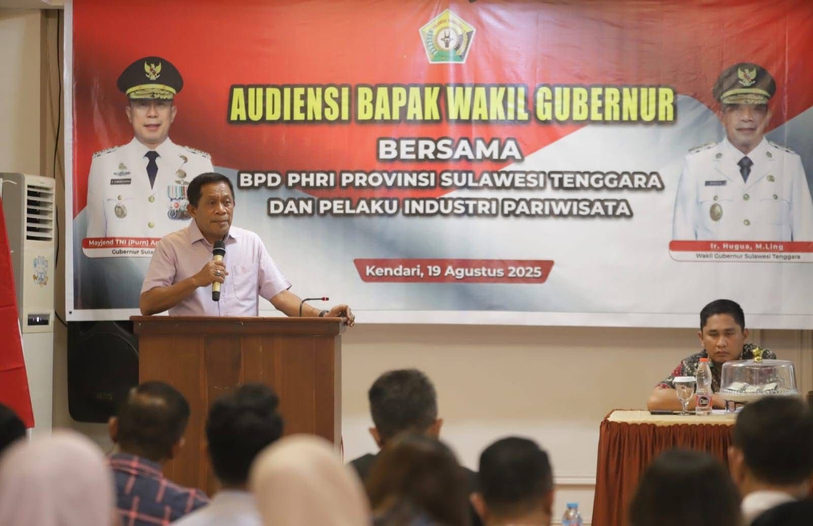 Kendari, Sultrademo.co – Wakil Gubernur Sulawesi Tenggara (Sultra), Ir. Hugua, menerima audiensi Badan Pimpinan Daerah Perhimpunan Hotel dan Restoran Indonesia (BPD PHRI) Sultra bersama pelaku industri pariwisata, di Hotel Venus Kendari, Rabu (20/8/2025).