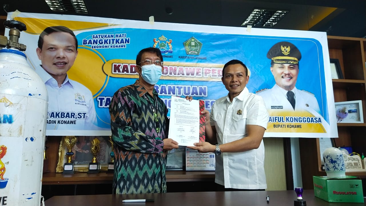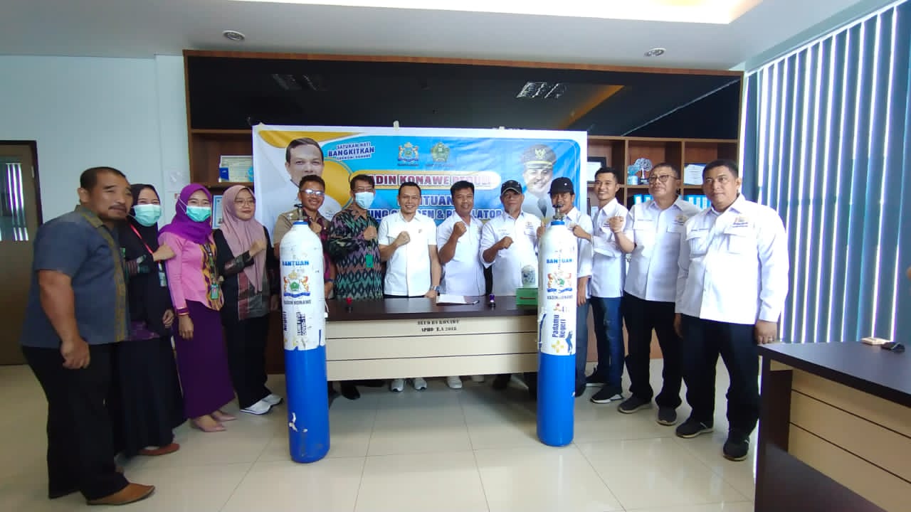 Pada kesempatan itu, Yusran menyerahkan secara simbolis bantuan Kadin Konawe berupa 50 tabung oksigen beserta regulatornya.